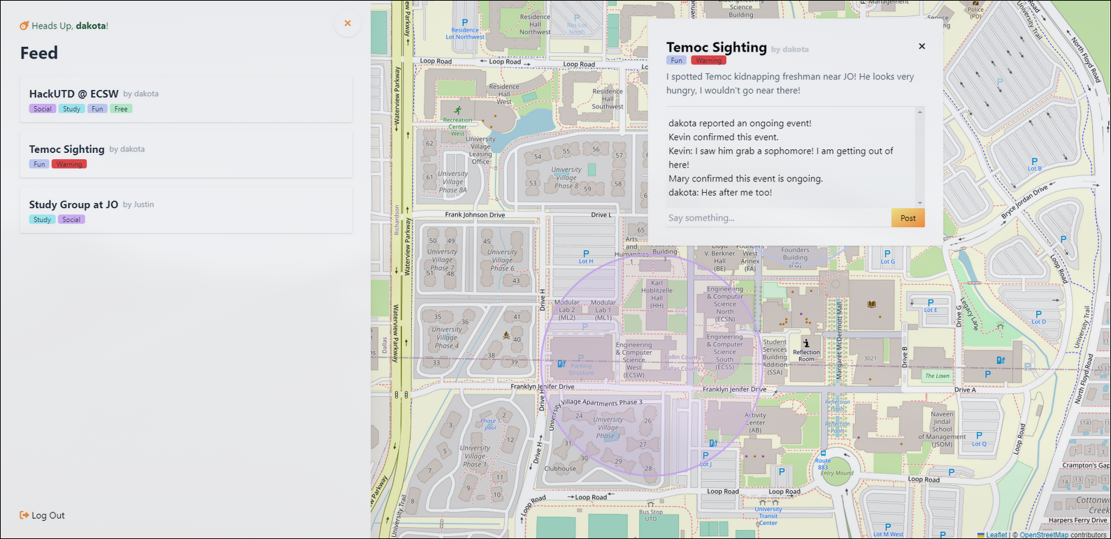Hackathon project that uses sockets for realtime map updates. Users can view, create, and react to events happening on the UTD campus